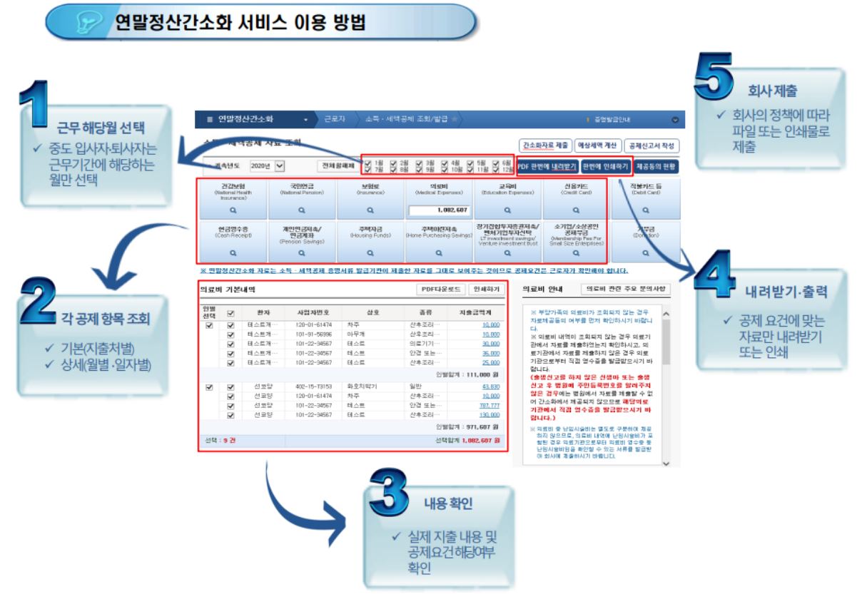 국세청 홈택스에는 간소화 서비스를 이용가능합니다. 위에서 말씀드린 필요 경비들을 한 번에 간소화해서 볼 수 있게 마련해 둔 것입니다. 그래서 여기저기 흩어져 있던 자료들은 홈택스로 모이게 되고 우리가 한 번에 조회해 볼 수 있는 시스템입니다.