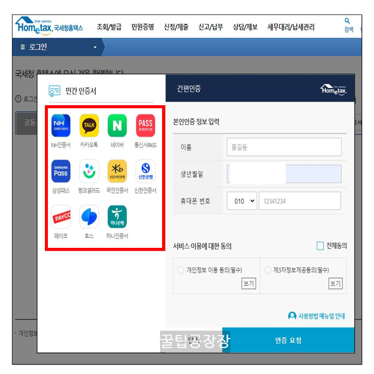 - 다음은 로그인을 진행합니다. 공인인증서 또는 간편 인증(카카오톡 인증, 은행인증, 토스 인증, 통신사 인증 등)