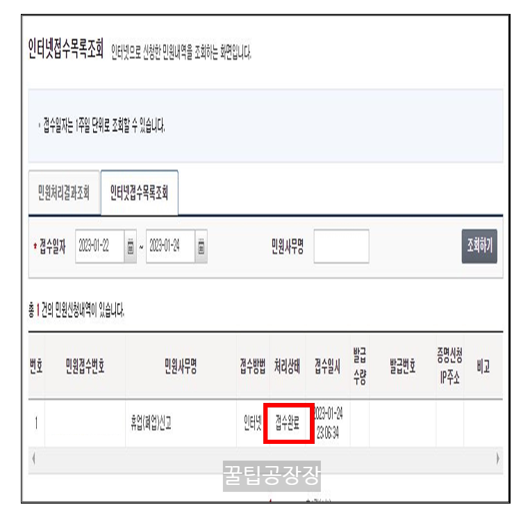 - 마지막 화면에 접수 완료 상태를 확인하시거나 나의 민원에 들어가서 처리 상태를 확인하시면 종료가 됩니다.