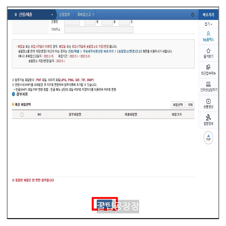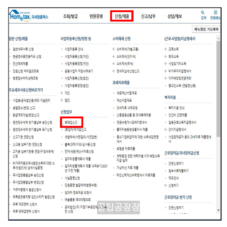 - 아래 그림처럼 상단에 '신청/제출'을 클릭- 신청업무 - 휴폐업신고를 순서대로 클릭합니다.