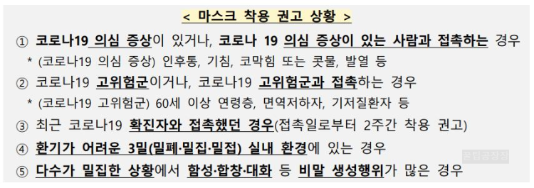 (접촉일로부터 2주간 착용 권고) - 환기가 어려운 3 밀(밀폐, 밀집, 밀접) 실내 환경에 있는 경우