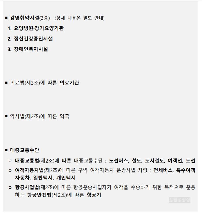 - 의료기관 : 의료기관은 면역력이 낮은 환자들이 모인 장소이고 병균이 많은 곳이기 때문에 바이러스에 취약한 곳입니다. 또 실제 코로나 환자가 감염 여부를 확인하러 오는 곳이기 때문에 마스크 해제가 되지 않고 의무 장소로 지정되었습니다. (의료기관 :의료법 제3조에 따른 의료기관과 약사법 제2조에 따른 약국)